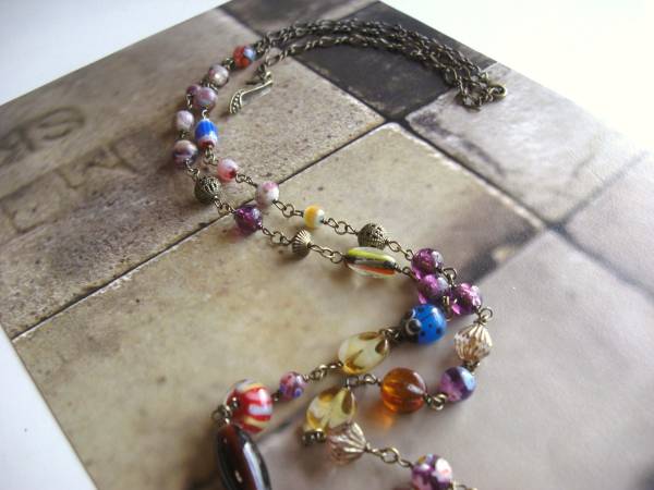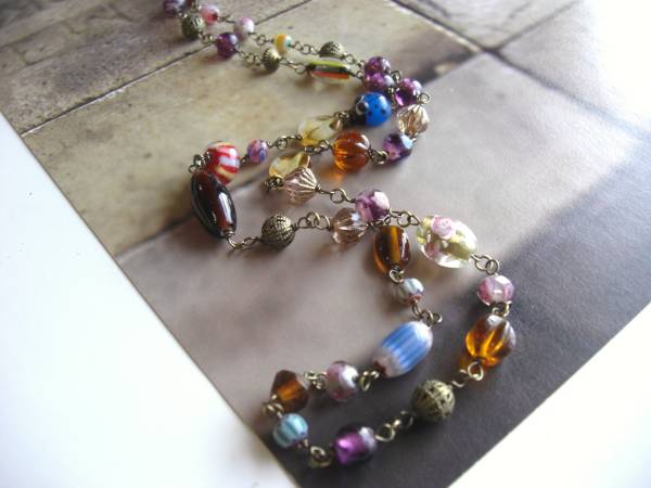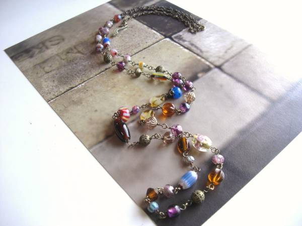 秋色・テキスタイル・・シリーズです♪オリエンタルに染まって・・アンティークビーズやトンボ玉、チェコビーズなどボヘミアンな雰囲気のネックレスです♪5ミリから18ミリ位までの丸玉やキューブやナツメなどデザイン違い、柄違いのビーズに透かし玉やメタルビーズを合わせて華やかな表情です♪長さは全長120センチ位で調節自由です♪2連にされても素敵です♪お揃いのブ レスレットも出品しています♪シンプルで飽きのこないいつまでも着けられるデザインを考えて作りました!ハンドメイドをご理解頂いてノークレーム、ノーリ ターンでお願いします