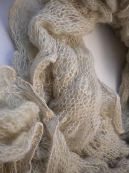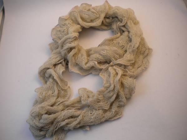 ★ゴムでクシュクシュっとなったストールです。★お色はベージュです。★素材はアクリル100%。★幅は約15cm、長さは160cmくらいです。★幅の違うマフラーを2枚張り合わせてゴムで縫い合わせたような状態です。★新品ですが展示品でしたので、多少の汚れはご了承ください。