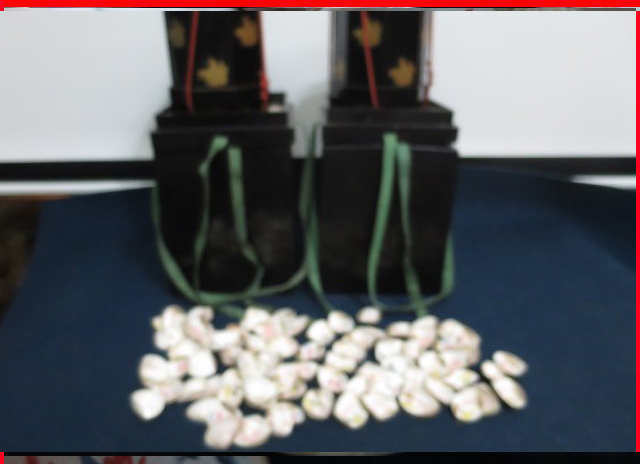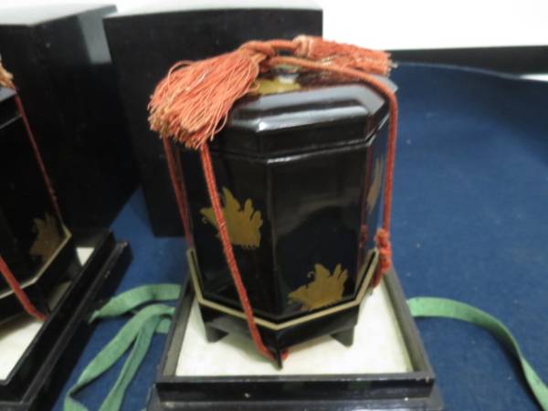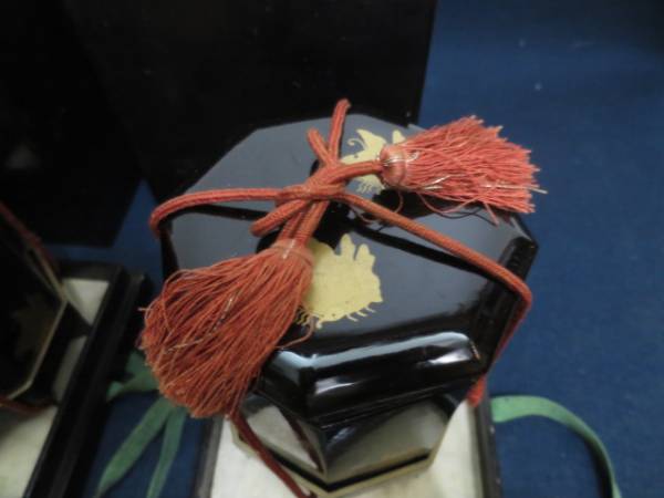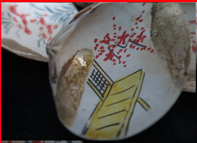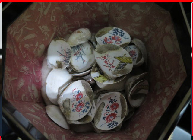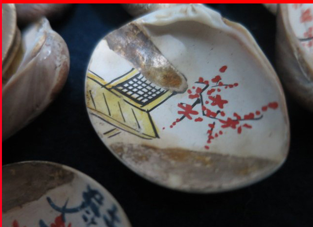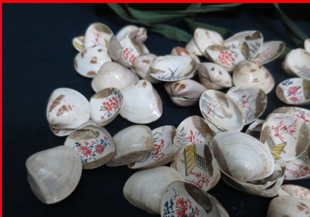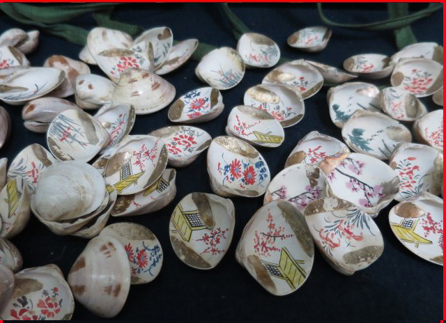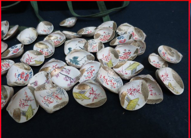 「貝合わせO-730」 揚羽蝶の家紋の入った黒漆塗りの貝桶です。 揚羽蝶の家紋は平家の紋所です。 貝は御覧のように沢山入っております。 貝のサイズは約、幅4cm高さ3.4cm位の蛤です。 |