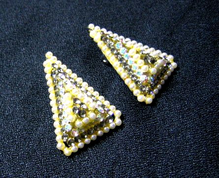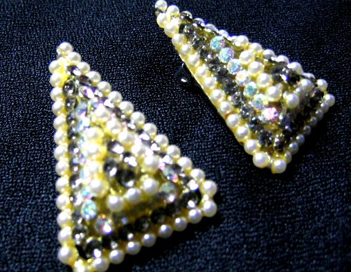 立体的な三角形のフォルムに、細かなストーンや人工パールがぎっしりと埋め込まれています。