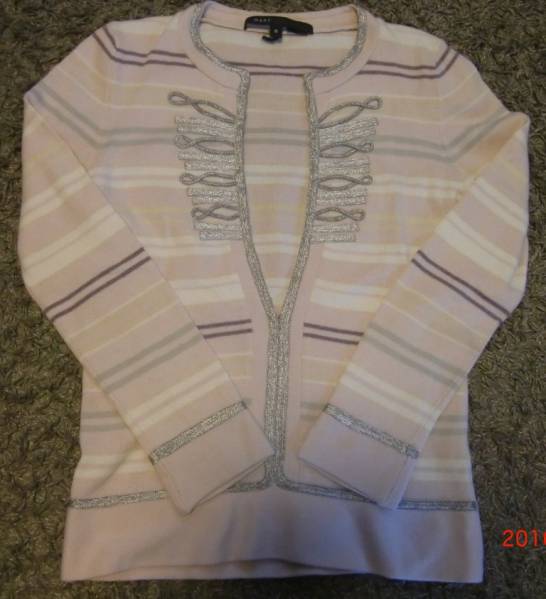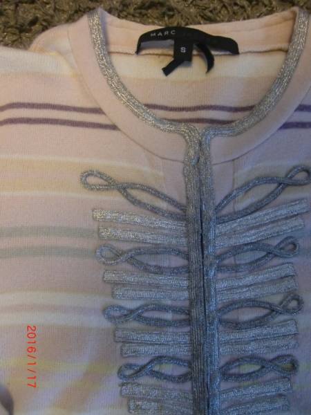 淡いピンク系のボーダーにシルバーの刺繍がポイントになった、マークジェイコブスらしいおしゃれなニットです。デニムなどに合わせても上品で華やかになりとても可愛いく、よくどこの?と褒められました。前はホックでインナーを見えてもいいですし、すべてとめてセーターのように着てもいいです。