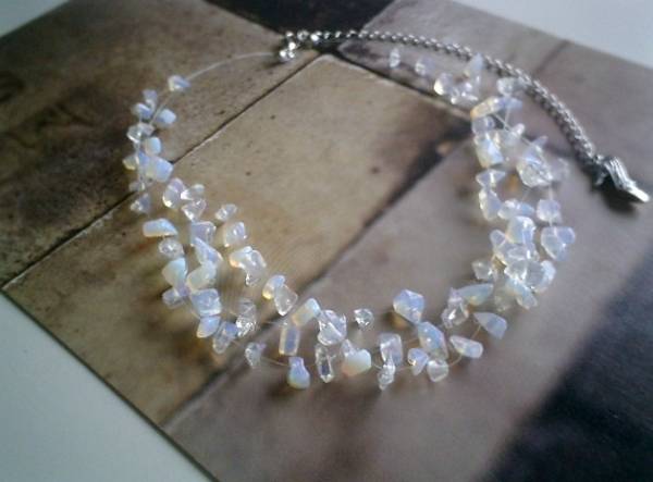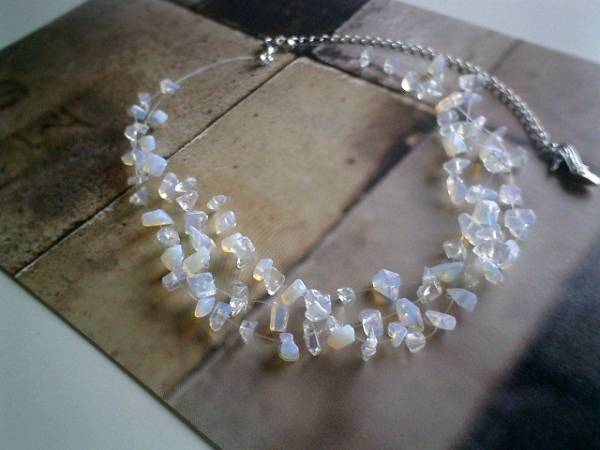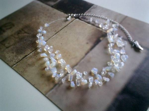 やさしい春色・・シリーズです♪アリスの虹・・神秘的なオパールのネックレスです♪半透明のホワイトオパールのさざれをテグスに繋いで3連のネックレスです♪動きのあるデザインが可愛いです♪さざれは5ミリから9ミリ位です♪長さは40センチ+アジャスター15センチで最長55センチ位です♪♪お揃いのブレスレットも出品しています♪シンプルで飽きのこないいつまでも着けられるデザインを考えて作りました!ハンドメイドをご理解頂いてノークレーム、ノーリターンでお願いします