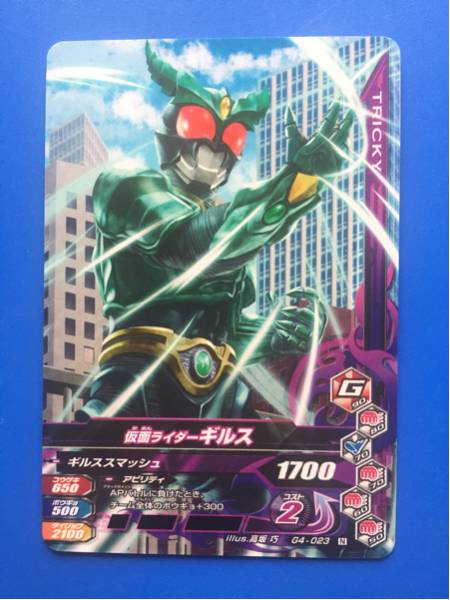仮面ライダー、ガンバライジング・第G4弾からNo.023《仮面ライダーギルス》の登場です。発送は、普通郵便を利用します。(特にご希望のない場合)おとりまとめも可能ですが、送料に変動する場合がございます。また、送料のご請求は、自宅での計量を基準にご請求させていただいておりますので、実際の金額と差異が出る場合もございます。予めご了承ください。他にも多数出品中です。まとめてこの機会にいかがでしょうか?ご質問お待ちしております。