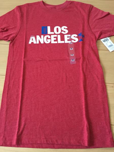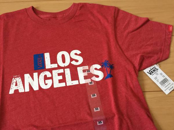 新品 カルフォルニアで購入しました。サイズはXSです。カラーはレッドです。素材はコットン50%ポリエステル50%です。LOS ANGELES プリントのT-シャツです。肩幅40cm胸回り82cm着丈64cm袖丈18cmです。