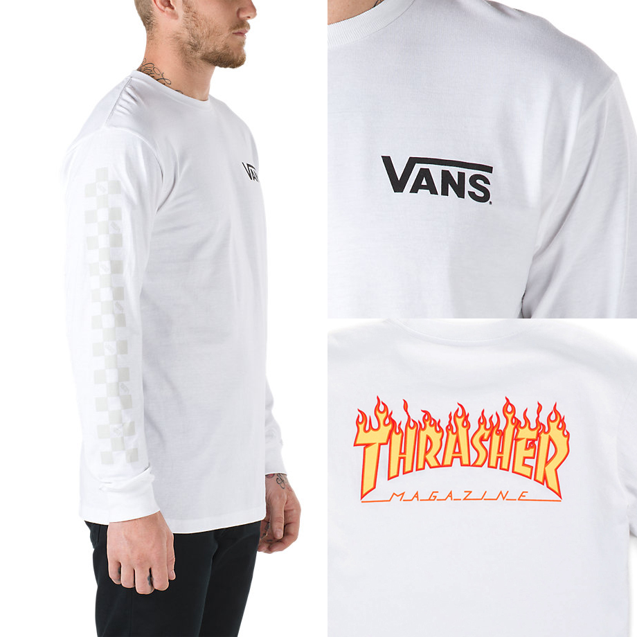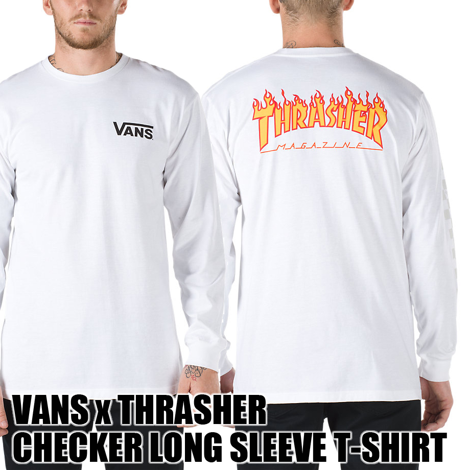 ・最強タッグのコラボレーション!VansとThrasherのリミテッド・コラボレーションシリーズの長袖Tシャツ(ロンT)。フロントは左胸にVANSの定番ロゴ、バックにはThrasherのフレームロゴ。そして、右スリーブにはVANSを象徴するチェッカー柄がプリントされております。 |