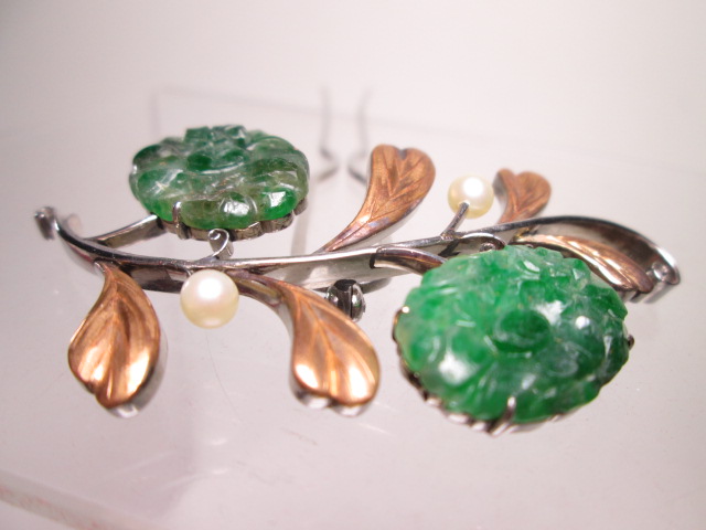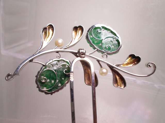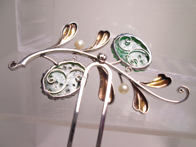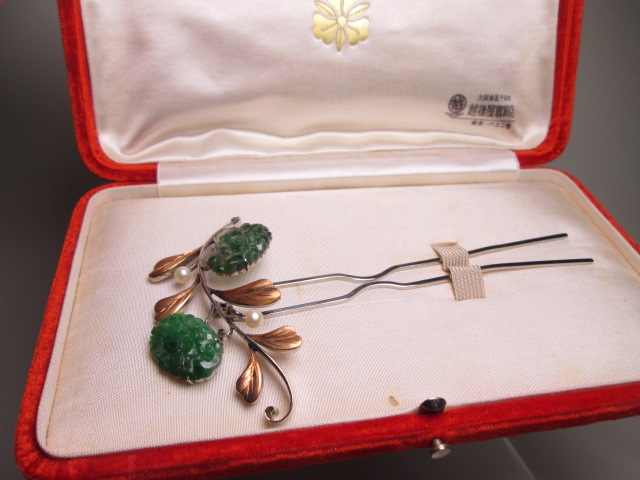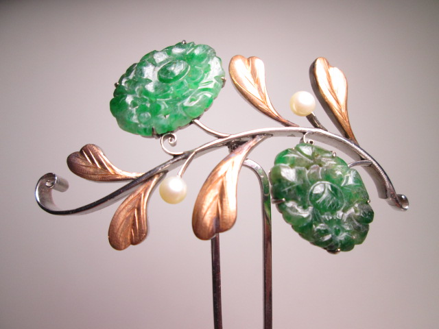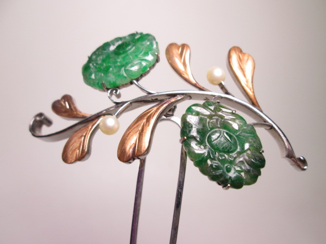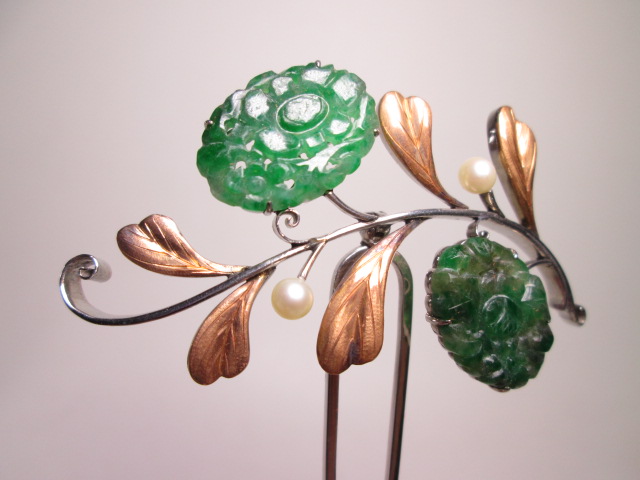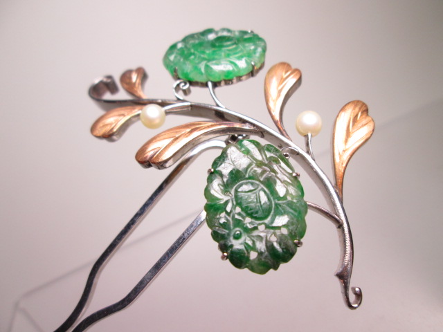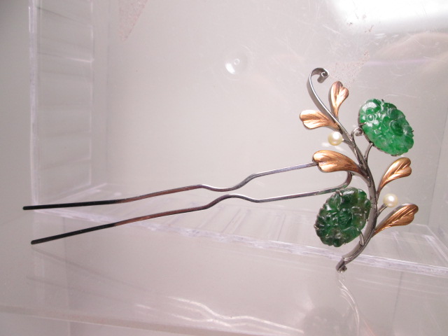 【江月】アンティーク・本翡翠 花透かし彫刻 本真珠飾り 金細工のかんざし 共ケース付