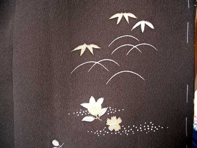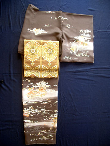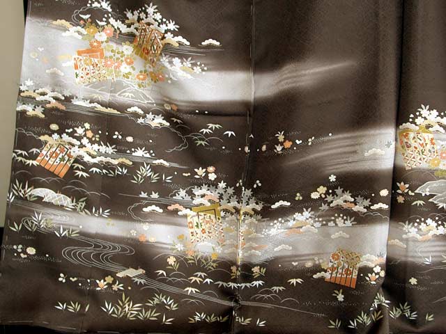 濃い目の焦げ茶の生地に、花柄と霞紋の粋な雰囲気の訪問着です。