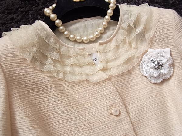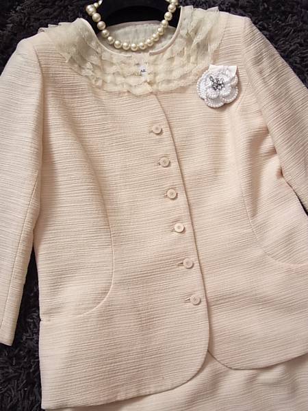 ジャケットのネック周りのフリルレースが可愛らしく、素敵なデザインのスーツです。