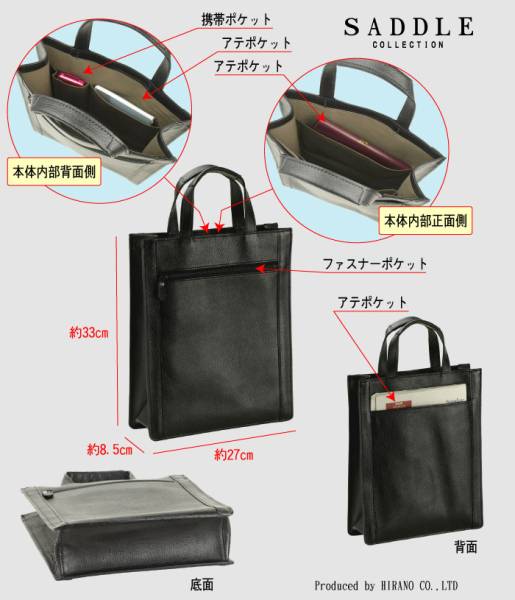 | ★サドルエリア SADDLE AREA 紳士の手提げかばん 書類や小物がザクザク入れられる 仕事 会合 カルチャー通いに ザックリと詰め込んで持ち運べる手軽なトートバッグ 持つ人のセンスを漂わせる本革製メンズバッグ 【バッグインフォメーション】 ◆サイズ : 横幅27×高さ33×厚み8.5センチ ◆素 材 : ソフト牛革 ◆カラー : (01)クロ ◆本体正面 : ファスナーポケット ◆本体背面 : アテポケット ◆本体内部 : アテポケット(大、小)、携帯ポケット ◆その他の仕様 : 底板付き ◆重 量 : 約560g ◆生産国 : 日本 ※ 予告なく仕様変更する事がありますのでご了承下さい。 | |