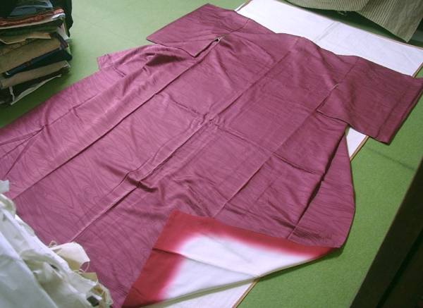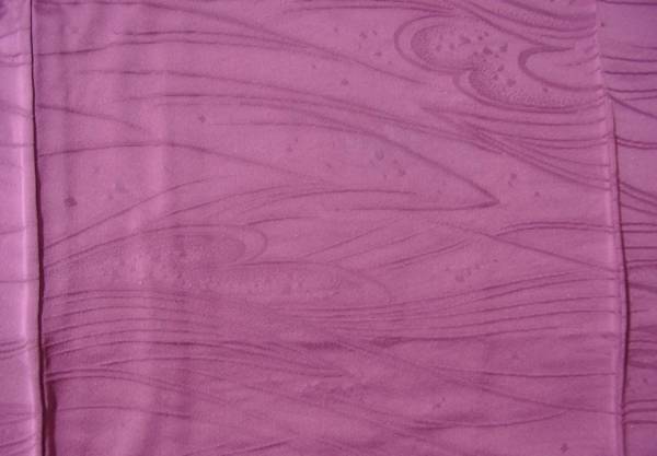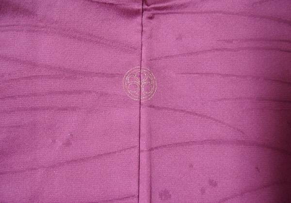 梅紫色の地に流水模様の地紋です。背中に一つ金糸の刺繍で丸に陰剣三つ星紋です。