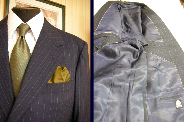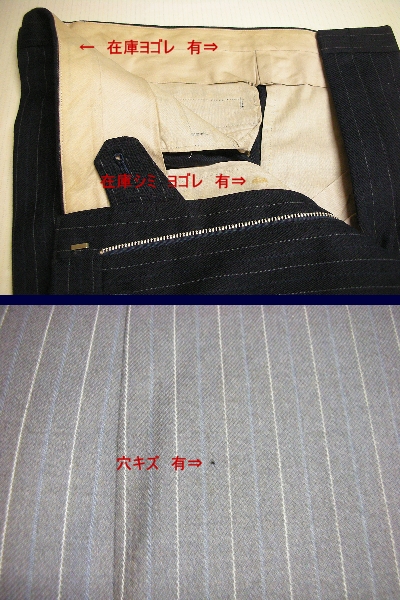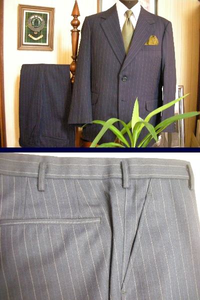 しっかりした地厚の純毛素材スーツ。エレガントなダークネイビー地に 9mm間隔で交互にグレー色とブルー色の細チョークストライプ柄です。超個性的ボールドルック モダンボーイファッションに最適。 また ドレスビジネスシーンにも最適。 Yポケット タック無しのノータックパンツ です。また センターベント シルエットはアーバンティなナチュラルテーパードデザインです。 気品あるシルエットで 生地は 毛 100%です。 サイズ(平置実測採寸)は 肩幅 42,5cm 着丈 69cm 身幅(脇下) 54cm 身幅(胴囲) 52cm 袖丈(肩先より) 55cm 太ラペル幅 9cm のノッチドラペル ウエスト 90cm(表示 B-3) 渡り幅 34cm 腿幅(股下10cmの所) 31cm 裾幅 23,8cm 前股上 30cm 股下(フリー状態) 80cmです。 勿論 新品です。ただ 三番目画像で示す様に レトロ品ゆえ 裏地に在庫シミ 後背下部分に矢印に示す様に穴キズ有りのジャンク品です。普段着 仕事着 等として ご活用下さい。こちらは、こだわりの優れた縫製の日本製品です。