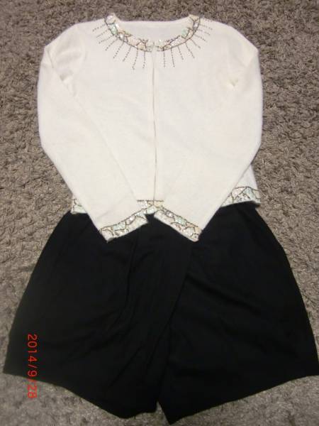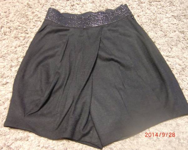 黒の少しサルエルっぽくなったショートパンツです。ふんわりのタック使いで、ショートが苦手な方でも抵抗感ないかと思います。ウエストのラメもこれからの華やかな季節に可愛いですよ。ゴムとチャック仕様になります。クリスマスにちょっとしたお食事会に着ていこうと思い購入したのですが、結局着ないまま保管しておりました。定価1万5千円ほど。セール前に完売しておりました。尚、いっしょに合わせているレッセパッセのビジューカーデも別出品中です。サイズ表記はフリー、ウエストゴムファスナー64cmから伸びます、総丈41cmです。素人採寸ですので、多少の誤差はご容赦願います。素材はウール100%、裏地ポリエステル100%です。