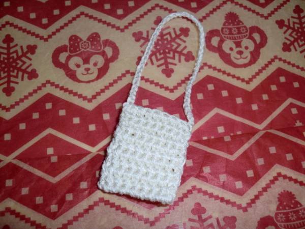 ポシェットはハマナカ・レース糸(エジプト綿)で編んでいます。ポシェットには、ディズニーシーで買った、スプリングヴォヤッジのシールを貼っています。シールは手芸用ボンドで貼っています。