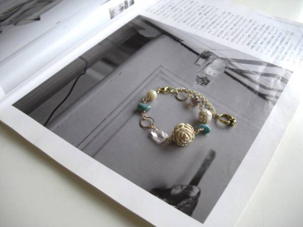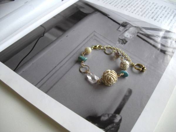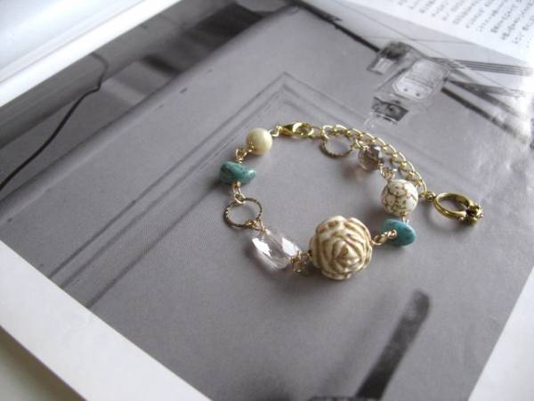 ニューヨーク・テイスト・・シリーズです♪白い薔薇・・個性的な石を集めたブレスレットです♪アフリカンオパールやターコイズ、スモーキークォーツやクラックルストーンやドイツ樹脂薔薇を合わせてロマンチックな表情です♪ターコイズのさざれやスモーキークォーツのラウンドカット、水晶のスクエアカット、アフリカンオパールの丸玉、ドイツの樹脂薔薇は16ミリ位です♪淡い色でまとめてやさしい表情です♪長さは全長23センチ位で調節自由です♪お揃いのブレスレットやネックレスも出品しています♪♪シンプルで長く着けていただけるデザインを考えて作りました♪ハンドメイドをご理解頂いてノークレーム、ノーリターンでお願いします