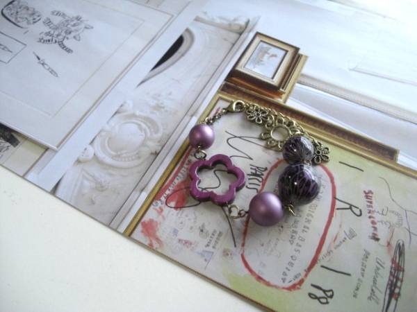巴里色スケッチ・・シリーズです♪真夜中のジャズ・・シックなダークパープル系でまとめたブレスレットです♪フラワーのシェルビーズや豹柄の樹脂ビーズや樹脂パールにフラワーチェーンを合わせてモードな表情です♪12ミリから25ミリ位までのシェルビーズや樹脂ビーズや樹脂パールです♪長さは全長23センチ位で調節出来ます♪お揃いのネックレスも出品しています♪シンプルで飽きのこないいつまでも着けられるデザインを考えて作りました♪ハンドメイドをご理解頂いてノークレーム、ノーリターンでお願いします