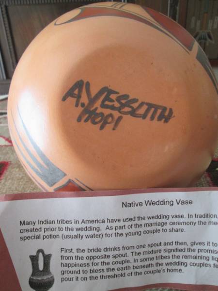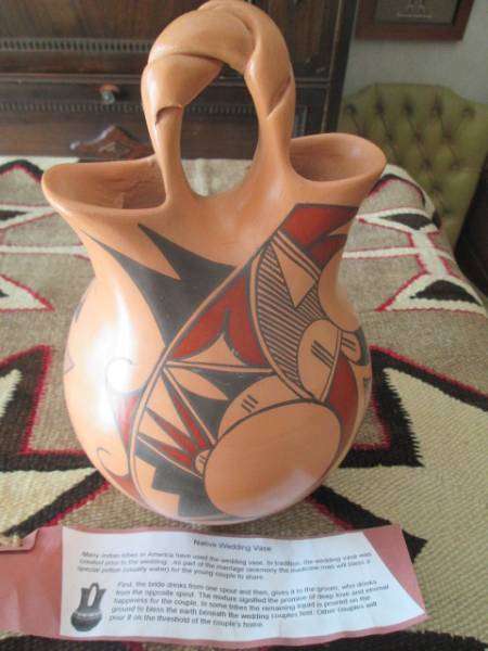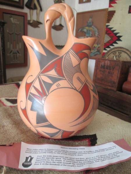 ★アメリカで購入しました。アコマ族などのプエブロ・アメリカ・インディアン(農耕定住型民族)は、精霊が宿ると考える大地に、きわめて強い信仰をいだいています。その「母なる大地」の土から作り出された陶器は、人と大地を結びつける、存在として尊ばれています。アコマ、テワ、ホピ、ラグーナ、サンタクララ、ズニなどのプエブロ(定住型)インディアンはすぐれた壺アーチストが多く優れた作品を生んでいます。壷は彼らの命を繋いできた大切な存在です。底面に部族と作者のサインが入ってます。多少日光で反射して薄く写っている箇所があります。両面とも同じ絵が描かれています。状態は美品状態だと思います。ウエディングベースと呼ばれるものでインディアンの信仰のベースの一つです。サイズは高さ約24cm、横幅(直径)最大16cmほどで祖大きい部類のものです。大変貴重なものです。ヴィンテージにご理解ある方よろしくお願いします。