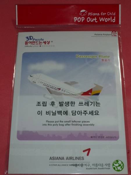 ☆商品説明☆ご覧いただきありがとうございます^^ アシアナ航空オリジナル!3D 組み立て式飛行機です。厚紙製。アシアナの飛行機でと~ってもかわいいですよ^^ 商品の台紙の大きさはタテ 約21cm、ヨコ 約15cmです。たいへん古いものですがコレクション用として大切に保管していましたので新品m未使用でたいへんきれいな状態ですが家庭で保管していた物になりますので紙製の為、多少のシワなどありますのでご理解いただける方のご入札をお願い致します。 ☆発送方法☆ 定形外郵便、ゆうぱっく ☆コメント☆ ノークレーム、ノーリターンでお願いします。ご不明な点がございましたらお気軽にお問合わせ下さい。他にも飛行機キャラクターグッズたくさん出品しております☆ 良かったらご覧下さいね*^^*