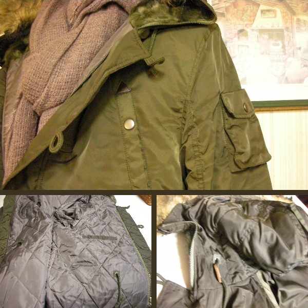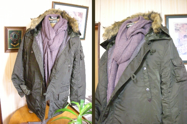 ジャンク市★微光沢ダークカーキ色キルティングモッズコート-LL