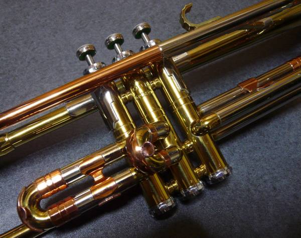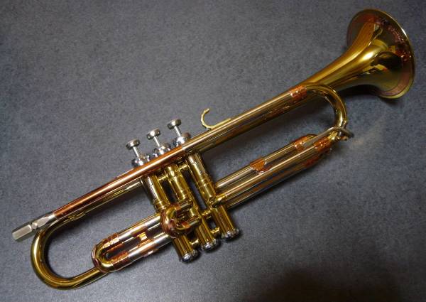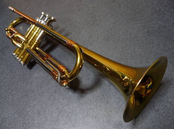 GETZEN SUPER DELUXE TONE BALANCED MODEL。1964年に火災で正確な年代はわかりませんが1950年台のものと思われます。オリジナルラッカー98%以上で凹みもなく非常に良いコンディションです。ピストンの気密性・動き、各スライドともにバッチリで即戦力でお使いいただけます。とてもユニークな楽器で非常に凝ったつくりの楽器となっております。ベルクランツ、コパーリードパイプ、板状の支柱、ピストンの構造などなどトランペット小僧の心を揺さぶる興味深いデザインになっています。レスポンスよくとても吹きやすいバランスよい楽器です。オリジナルケースが付属します。お見逃しなく!よろしくお願いします。