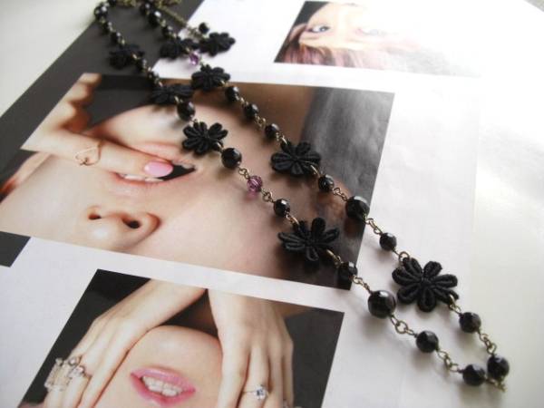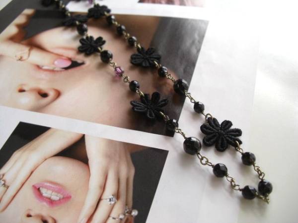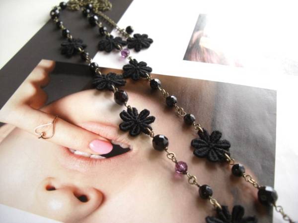 アンニュイ気分で・・シリーズです♪ジャンヌの首飾り・・シックなオニキスと黒のレースのお花のネックレスです♪6ミリ、8ミリのラウンドカットのオニキ スに20ミリ位のレースのお花やスワロのアメジストを合わせて可憐な表情です♪長さは全長95センチ位で調節自由です♪2連にされても素敵です♪お揃いの ブレスレットも出品して います♪シンプルで飽きのこないいつまでも着けられるデザインを考えて作りました!ハンドメイドをご理解頂いてノークレーム、ノーリターンでお願いします
