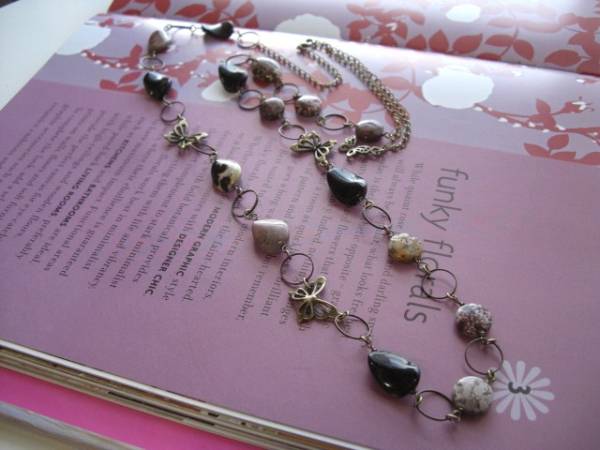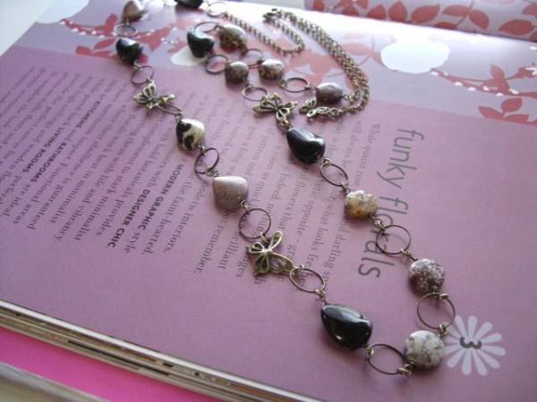 特別な一日・・シリーズです♪小さな蝶をアートして・・シックなオニキスとジャスパーのネックレスです♪オーバルツイストのオニキスに様々な模様の入ったキュートなピクチャージャスパーや蝶の透かしチャームやデザインリングを合わせてニューヨーク・モダンしています♪オニキスは18×13ミリ位、ジャスパーはオーバルやコインです♪長さは全長100センチ位で調節自由です♪2連にされても素敵です♪お揃いのブレスレットやピアスも出品しています♪♪シンプルで飽きのこないいつまでも着けられるデザインを 考えて作りました!ハンドメイドをご理解頂いてノークレーム、ノーリターンでお願いします