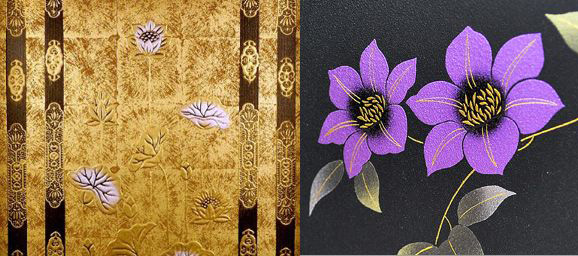 漆(うるし)で文様を描き、乾かぬうちに金、銀、錫(すず)