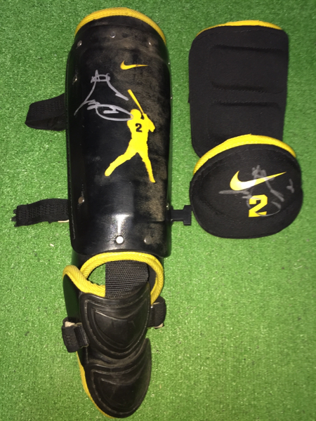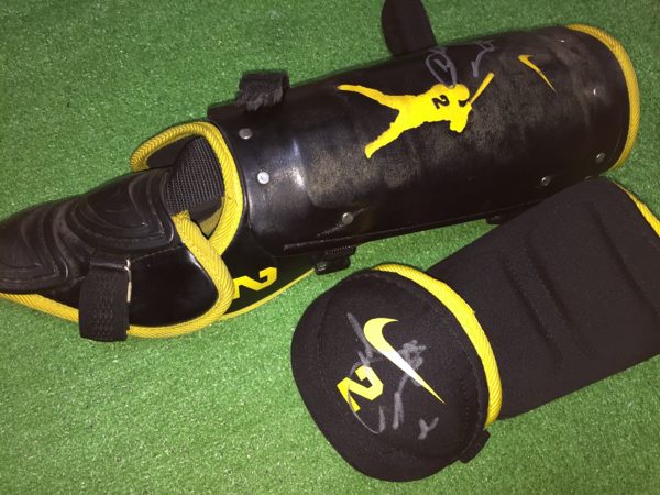 阪神タイガースの城島健司選手が’10シーズン公式戦で実使用した打撃用の肘と足の防具です。各直筆サイン入りです。
