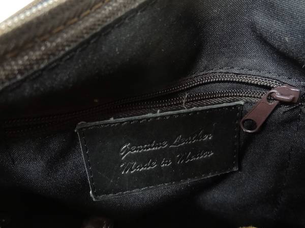 ジッパーは無刻印です。ラウンド型のパッチワークデザインがとても秀逸です。大きすぎず小さすぎないサイズも丁度良いです。珍しいのはこのタイプのバッグはストラップが手持ちタイプが多いのですが,これはトートバッグのように肩からもかけられるくらい長めのストラップということです。ありそうでないデザインです。レザー自体もクォリティーもしっかりした素材を使用してあります。使い込むほどにアジも出てくるので今以上に雰囲気は増してくると思います。男女問わず使えるデザインです。