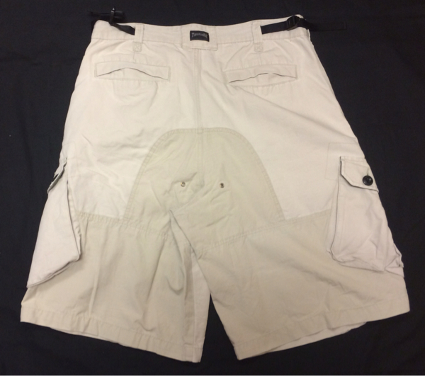 オフホワイトに近いライトベージュ×ベージュのバイカラーで、切り替えしのデザインが良く、左右のカーゴポケットの形も異なります。シンプルながらも機能性・デザインに優れたショーツです☆