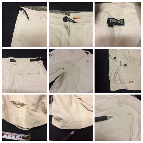 スラッシャーのミリタリー風のディテールのカーゴショーツです☆ ウエスト両サイドにアジャスター付きですので多少サイズ調整可能です。(実寸をご参考下さいませ) トップボタンの下にゴムの輪っかがあり、トップボタンでウエストが閉まらない場合はゴムで止めれます。