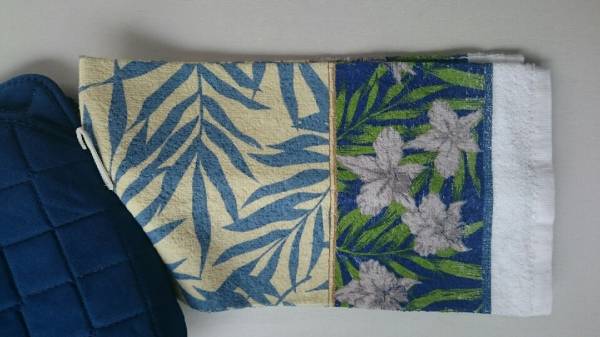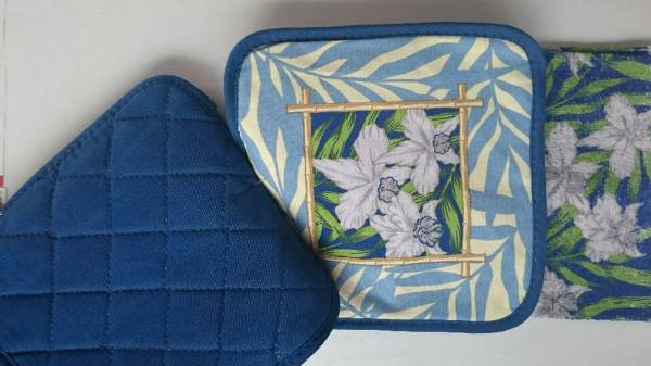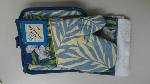 キッチングロ-ブ、ポットホルダ-2枚、キッチンタオルの4枚セットです。ハワイで食事をしている気分になります。