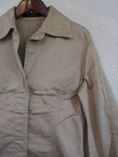 | 商品紹介 | ベージュのシャツジャケットです。 開襟に隠しスナップボタン、身頃もウエストがシェイプされた すっきりとした形です。 袖は7分で、袖口に5cm程スリットが入っています。 《素材》 コットン95% ポリウレタン5% |
