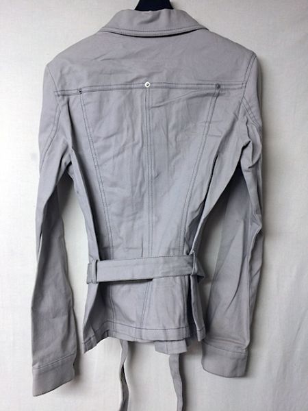 OZOC ベルト付きデニムブルゾンです。色はライトグレー。ストレッチ素材です。◆綿95% ポリウレタン5%◆サイズは38で着丈約53cm・肩幅約38cm・袖丈約59.5cm・身幅約40cmです。◆USEDですが状態は良好です。◆