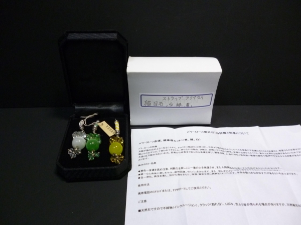 猫目石(キャッツアイ)パワーストーン 金運・健康運セット 新品です。 黄色・緑・白の3種類のカラーの猫目石ストラップになります。 運気が上がるかも知れませんよ! キーホルダーや携帯ストラップとして如何でしょうか? 定価=5980円、もし定型外郵便で簡単な梱包でよろしければ全国290円で発送可能です。 よろしくお願いします。