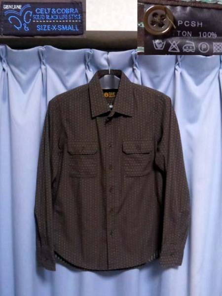ケルト&コブラのシャツです。定価18,900円。サイズはXSです。(肩幅39cm 身幅48cm 着丈68cm 袖丈61cm)素人採寸の為多少の誤差はお許し下さい。状態は使用感ありで10の7位だとおもいます。胸ポケは2つです。これからの時期さらりと着れるので大変いいと思います。ノークレーム・ノーリターン・ノーキャンセル、送料は別途ご負担お願いします。