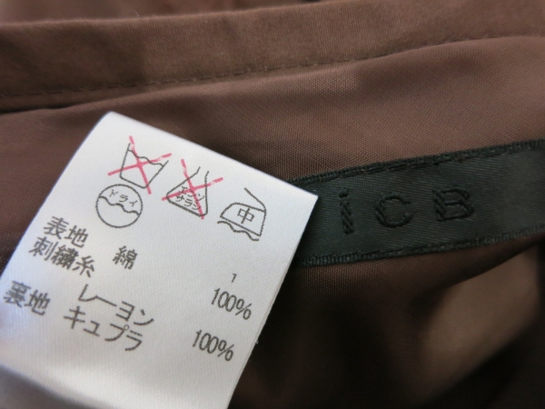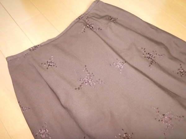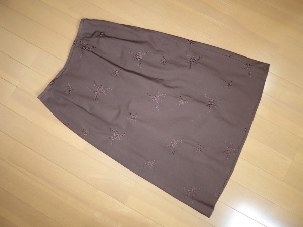 オンワード樫山 ICBのスカート 茶色 綿100% 7号です。花の刺繍が施されています。平置でウエスト32cm、丈58cmです。普段9号の方でも大丈夫だと思います。とても素敵です。ご検討宜しくお願い致します。未使用ですが、保管期間がありますので畳み皺がございます。ノークレーム・ノーリターンでお願いします。(A3)