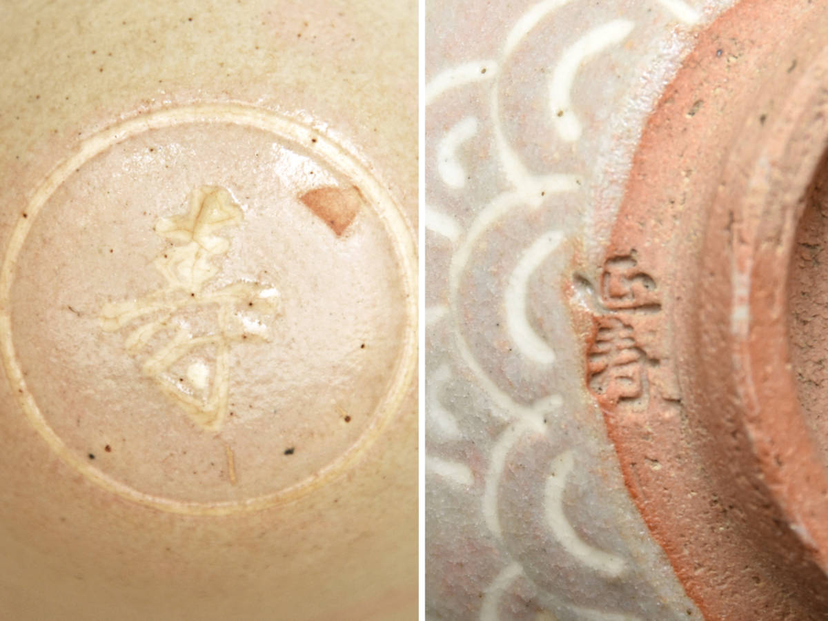 坂部萬古延寿窯 佐藤友宣(造)御本三島青海波 汲出碗4客です。 温かみある土味に、釉薬がたっぷりと掛けられ、轆轤目、高台付近の青海波が良く、見込みには「寿」の字が書かれております。 造形美も見事で、扱いやすい一品です。 美品ですのでキズ等なく良い状態です。 ※撮影の際に生じた写り込みなどがございます。 ご理解の程よろしくお願い致します。 |