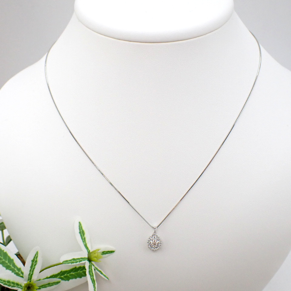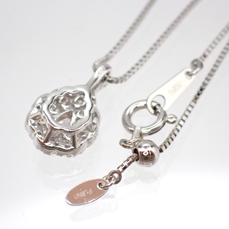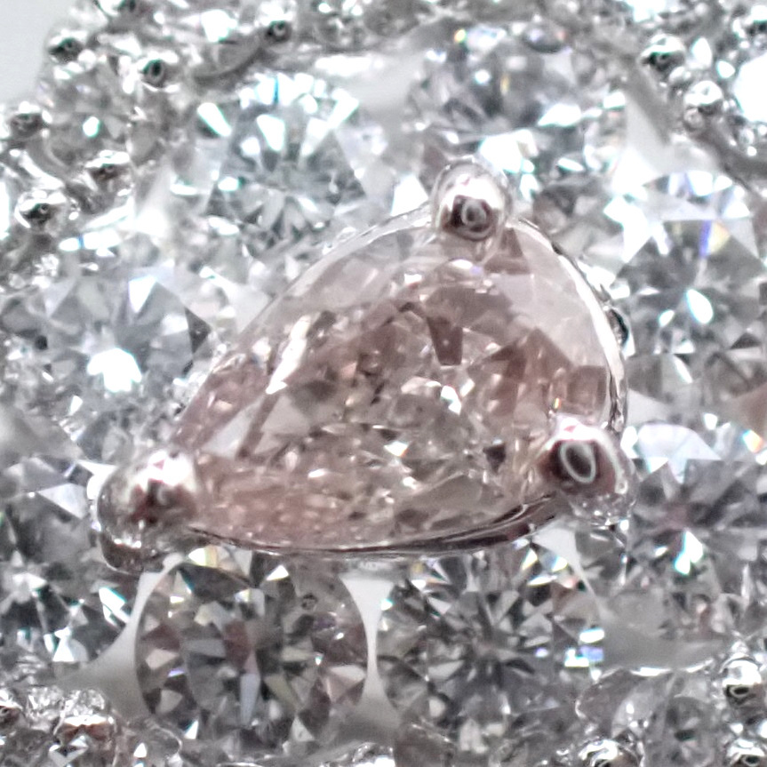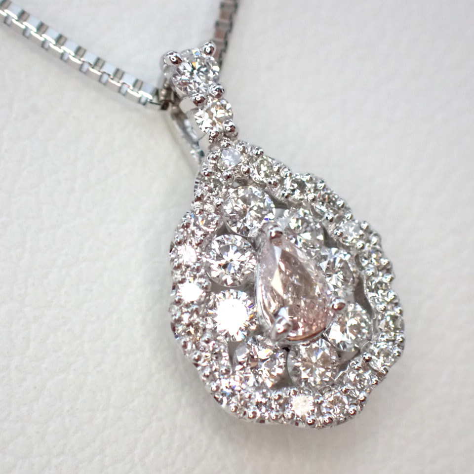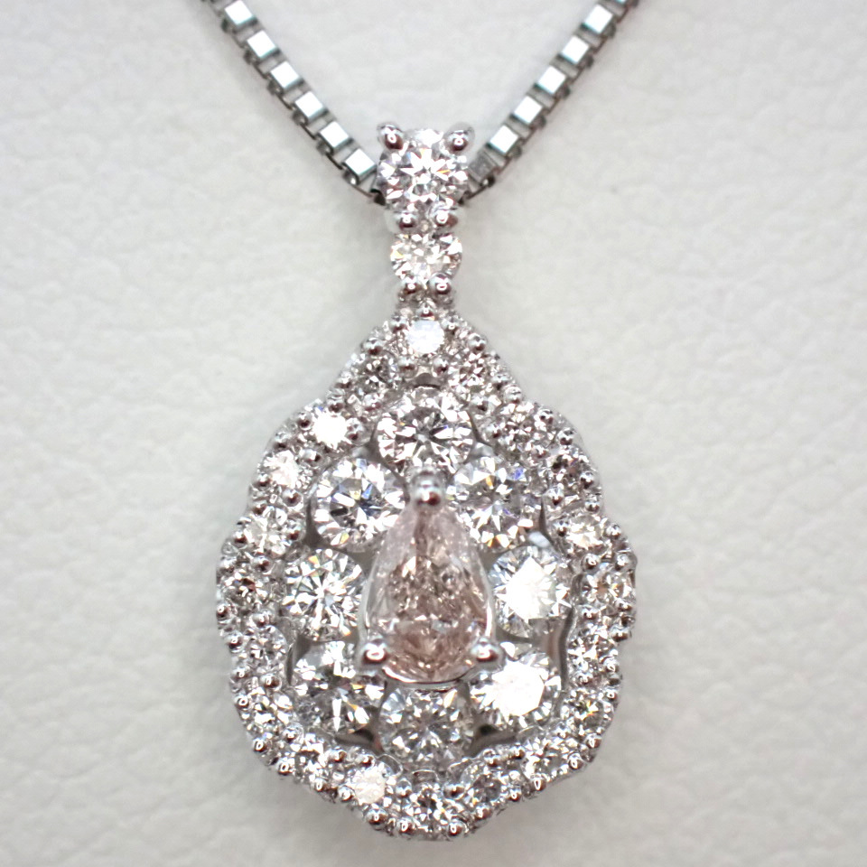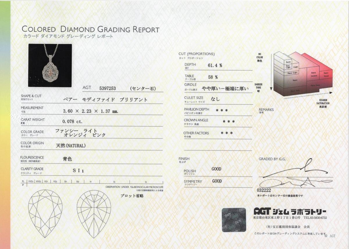 ご覧いただきまして誠にありがとうございます。 当方は真面目に商品とお客様と向き合って行きたいと考えております。 どうぞ宜しくお願い致します。 ・中石 ピンクダイヤモンド 0.078ct FLOP/SI1 ・脇石 ダイヤモンド 計0.29ct ・素材 PT950/850(刻印あり) ・重量 約3.26グラム ・最大縦幅 約13.4ミリ(カン部分含む) ・最大横幅 約8.0ミリ ・最大厚み 約4.5ミリ ・全長 45センチフリーアジャスター付 ・状態 新品 ・付属品 AGT鑑定書・当店保証書 ピンクダイヤモンドジュエリーのご紹介です。 カラーダイヤにおいて国内の鑑定機関では中宝研と並んでトップの信用と実績のある、AGTの鑑定書付きです。 カラーグレードはファンシーライトオレンジィピンク。 クラリティグレードはSI1。 ポリッシュ(研磨状態)とシンメトリー(対称性)は共にGOOD。 色の起源はもちろんナチュラル(天然)です。 淡い色味ですが、透明度が高くて輝きが強く、実に綺麗です。 プロポーションも良く、ダイヤモンドらしい輝きをしっかりとお楽しみいただけます。 デザインも大小の上質メレダイヤモンドを使用し、地金のツメを緻密に配置することによって可能となった、丸みのある輪郭が実に美しい高級デザインを採用しております。 濃厚なピンクダイヤモンドは当然素敵ですが、その分お値段も素敵です。 こちらのようにさりげなく真に美しいピンクダイヤモンドもお試しください。 是非この機会にいかがでしょうか? ※「興味はあるけど少し不安で購入に踏み切れない」という方は「返品について」に記載してございます、「安心の無料返品システム」をご参照の上ご活用いただければ幸いです。 ご質問などお気軽にお問い合わせください。 誠実に対応させていただきます。 | |