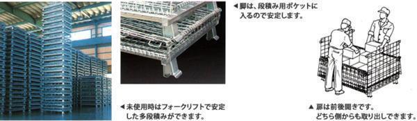 商品詳細 | この度は数ある商品の中から当商品を閲覧頂きまして有難う御座います。 販売価格 33,330円(送料・税込み) 商品名:サンキン メッシュパレットマルチタイプ 『CML-4』 (前後扉全開式・キャスター別)(前後の扉が半開・全開どちらも可能タイプ) 特徴: ●メッシュ構造で軽量ながら、強度は抜群。 ●組み立て、折りたたみが簡単で、折りたたんでおけば、保管スペースをとりません。 ●前後両面に扉が付いて荷物の出し入れに便利! ●脚が入る段積み用ポケットで安定した多段積みが出来ます! ●フォークリフト作業が容易で、作業効率があがります。 ●表面処理は三価クロム電気亜鉛メッキ塗装で防錆力アップです。 商品詳細: ●最大積載荷重(kg):1250 ●自重(kg):69 ●呼称寸法(mm)奥行×間口×高さ:1000×1200×900 ●最内寸法(mm)奥行×間口×高さ:970×1150×750 ●フォーククリアランス(mm)奥行×間口:670×1078 ●脚部高さ(mm):100 ●最大積載段数(段):4 ●線径(mm):6.0 ●網ピッチ(mm):50×50 ●ゲート:前後扉は、下まで全開 ●三価クロム電気亜鉛メッキ サイズ違い、仕様違いも数多く取り揃えておりますので、お気軽にご質問下さい。 この他のサイズ・仕様はこちらをご覧下さい。 |