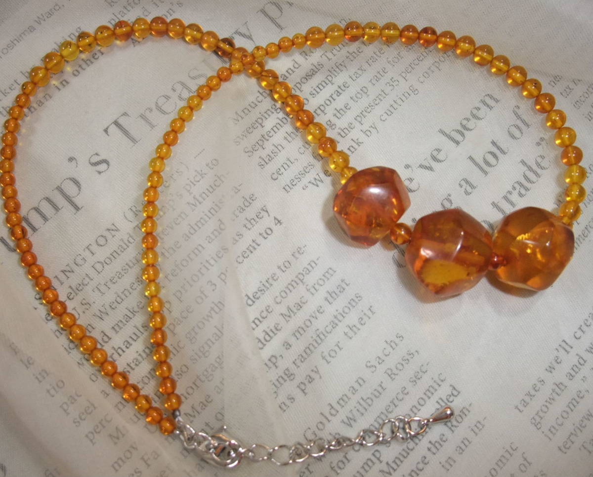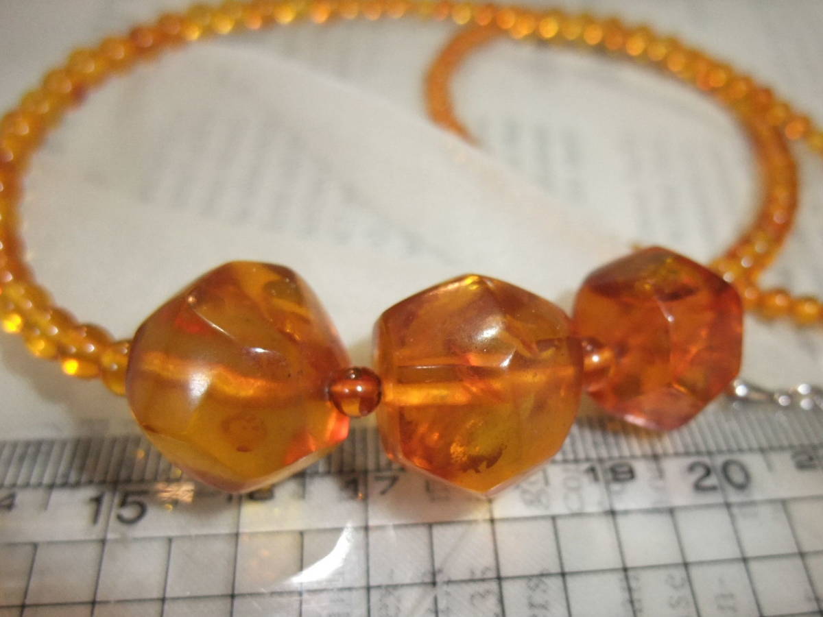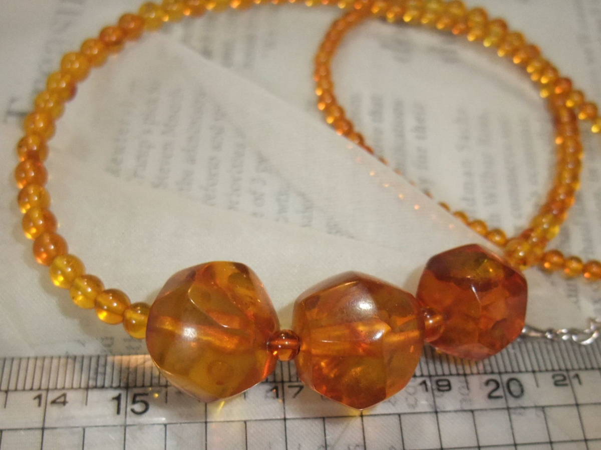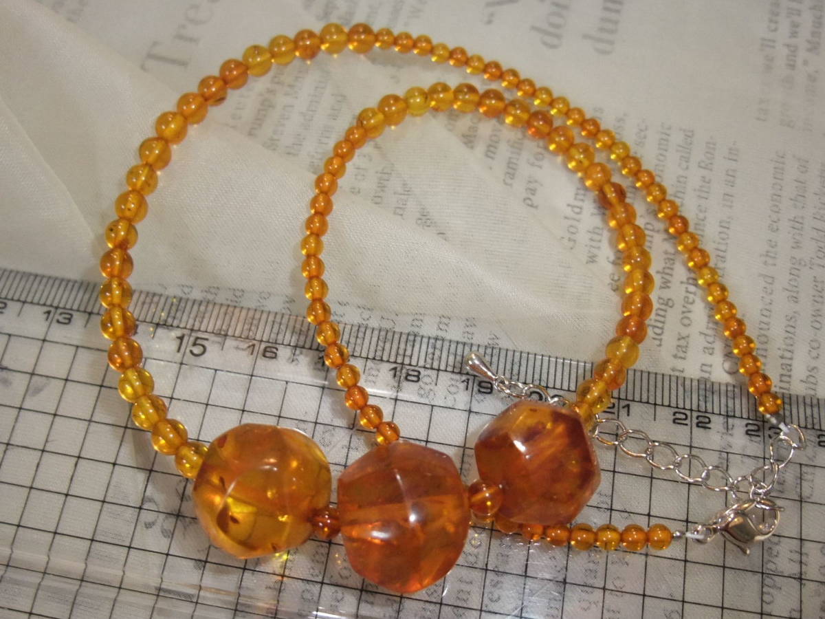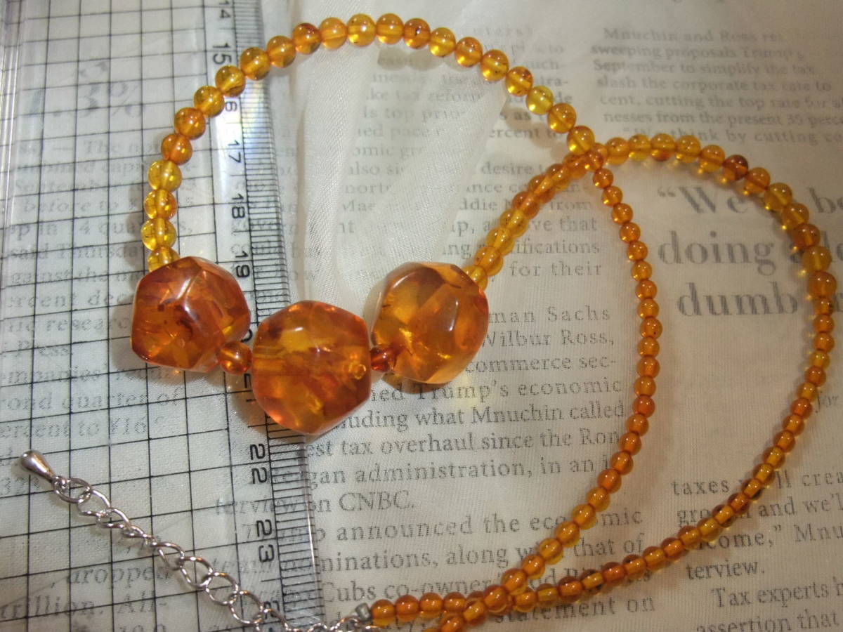 本場、東欧産の本琥珀を使用した、本物のアンバーネックレスになります♪このシリーズは、コハクの本場のバルト三国、主にリトアニアのルースをネックレスに組み上げたものです。長さは金具部分含みで47センチです。大き目の琥珀の玉は約1.5センチあります。 造りとしては割合最近のものなのでしっかりとしていると思いますが、ルース自体は古い時代のものも混じります。中には極上のルースなども使用していてとってもお得感あると思いますが、ルースの中には古いものもありますのでスレキズ経年感はご理解ください。画像・質問などで吟味の上、慎重にご入札ください☆最近ではすっかり価格の上がってしまった、東欧産の本琥珀、この価格なので、普通にアクセサリーとして使用するのはもちろん、製作をされる方にはお素材としてもお薦めです☆特にパワーストーン好きの方、銀細工をされる方にもとても人気のお品です♪♪