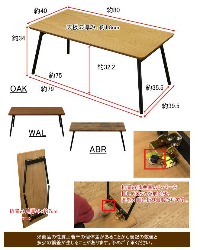 ・天板:天然木化粧繊維板 ABR/合成樹脂化粧繊維板(PVC貼り)、OAK/オーク突板(ラッカー塗装)、WAL/ウォールナット突板(ラッカー塗装)
