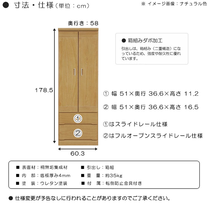 特  徴桐無垢集成材を使った、国産洋服タンス。