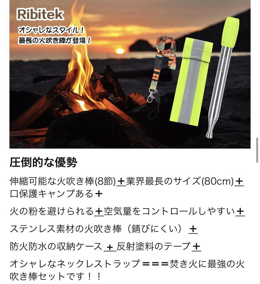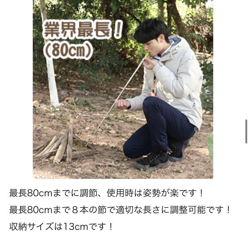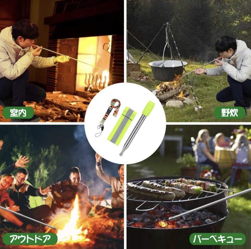 1、8段自由伸縮式で、展開最長80cm、伸縮式火ふいごの中で一番長いとも言えます。火起こす時、髪の毛や顔など火に焼かれたり、ほこりにかかられる事もなくて使えるます。