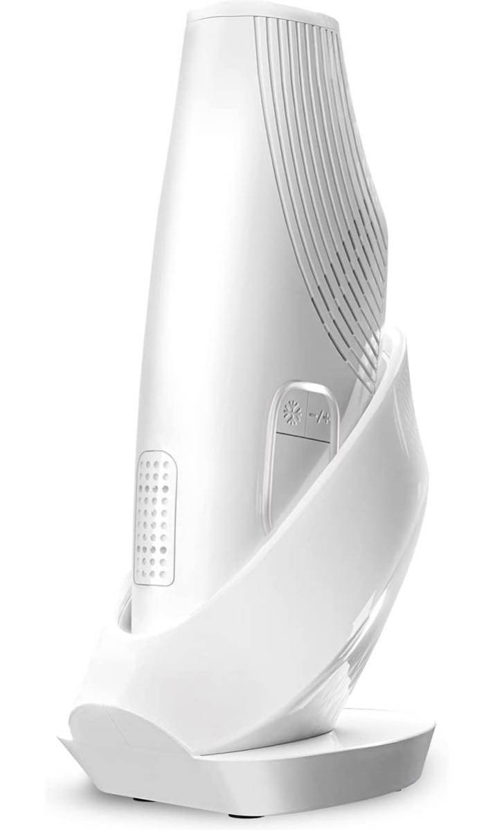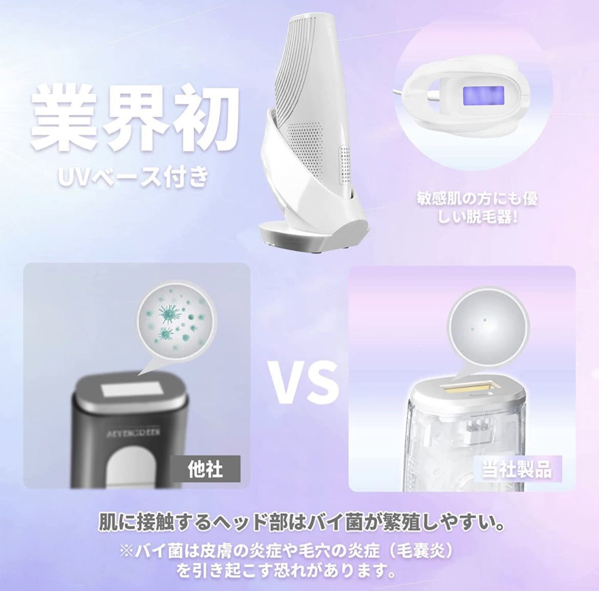 【業界初│UVベース付き】オートクリーンシステムを搭載、脱毛後、付属のUVベースにセットするだけで、照射面をクリーンにできます。使用中の肌の敏感さや刺激を抑え、使用部位の赤みやアレルギーを防ぐことができます。※お客様により長く製品をご使用頂きたく、サファイアと機器を短時間で冷却できますように、電源が切ってもファンが10秒ぐらい回り続けます。故障ではありませんので、ご安心ください。
