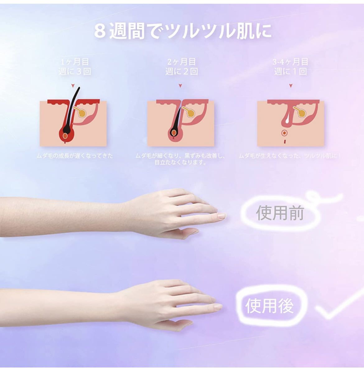 【最大18.0Jハイパワー&先端冷却技術】最短4週間でムダ毛ケアサロンと同じ効果が出ます。従来のIPL技術より強いサファイア冷感無痛脱毛技術を採用して、脱毛部位の表皮温度は瞬時に10℃まで下がります、快適感を高め、痛みを伴わずに脱毛しやすくなります。VIO 最も敏感な地域でさえ、完全に無痛で脱毛をすることできます。