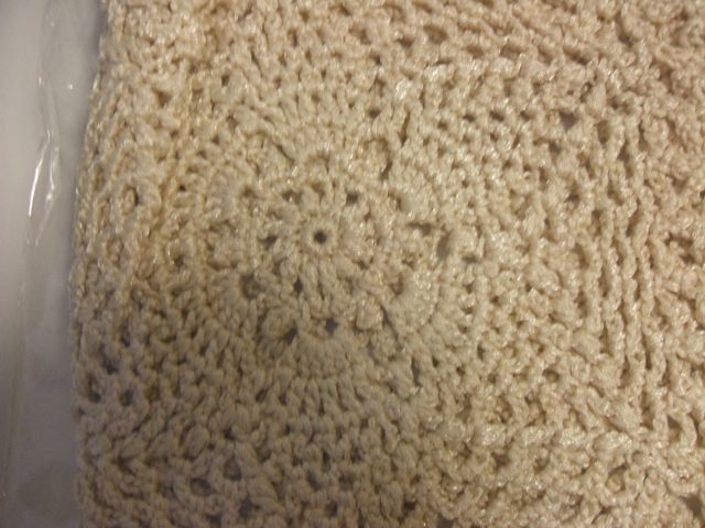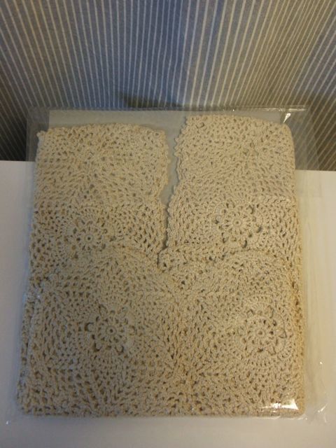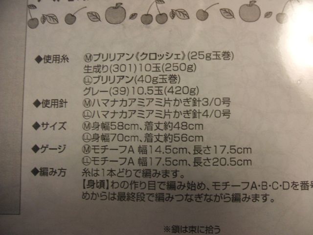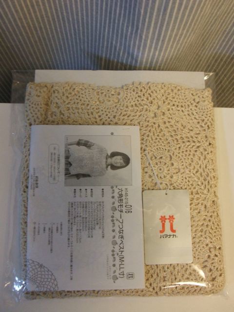 六角形モチーフつなぎベスト。手編みされたもの。ハマナカのブリリアンクロッシェ生成りを使用。綿(超長綿)78%ナイロン22%。Mサイズのようです(身幅58センチ着丈約48センチ)。未開封でしたが、封は開けましたが中を広げてはおりませんので、実寸サイズはわかりません。毛糸のみの定価は5,775円のようです。家庭保管品ですので、ノークレーム・ノーリターンでお願い致します。規定サイズ内におさめるため厚紙を抜いて小さく畳んでよろしければ、ゆうパケットや宅急便コンパクトで発送できます。他にも同様のグッズを出品していますので、ぜひご覧下さい。