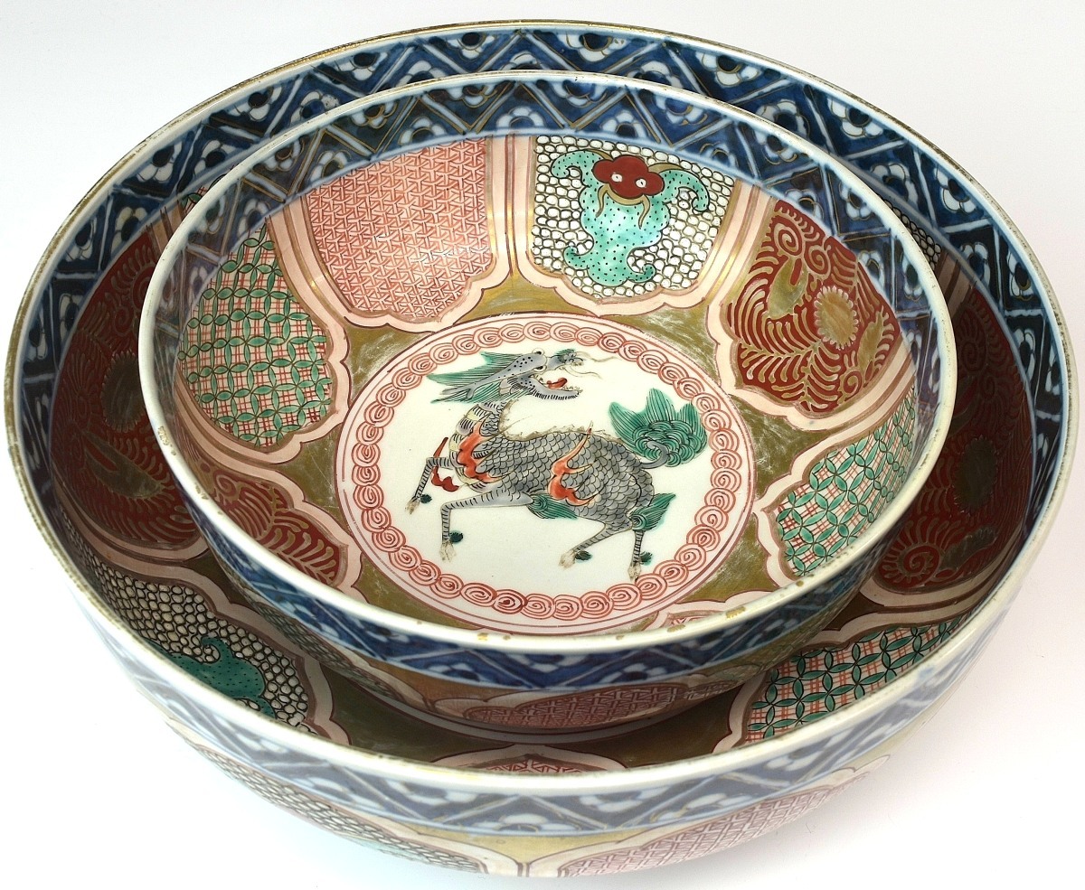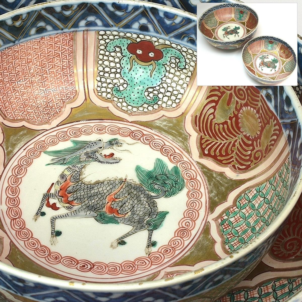 | 商品名 | 【趣楽】 明治時代 古伊万里麒麟図細密小紋鉢大小 直径21,2~27,6cm V1851 | ||