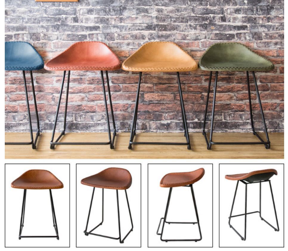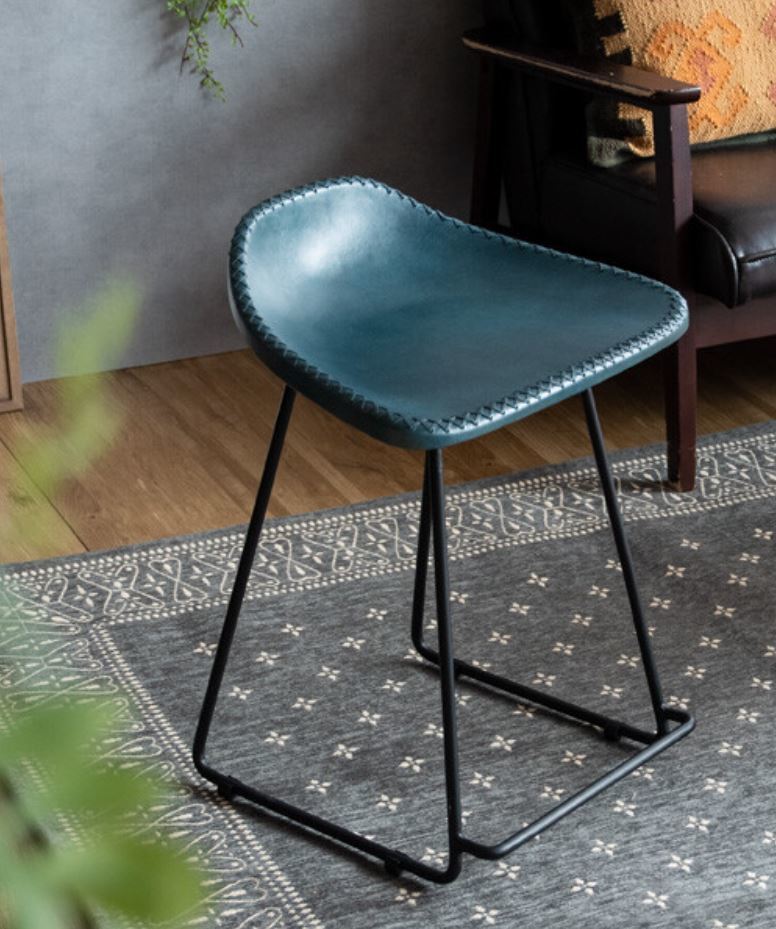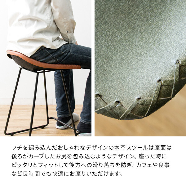 フチが編み込まれた革の座面と広がったフレームが特徴的なスツールです