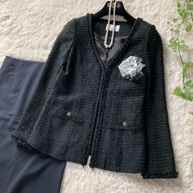 M-PREMIER BLACKのブラックのツイードジャケットとtheoryの濃紺のタイトスカートをセットアップにしました。