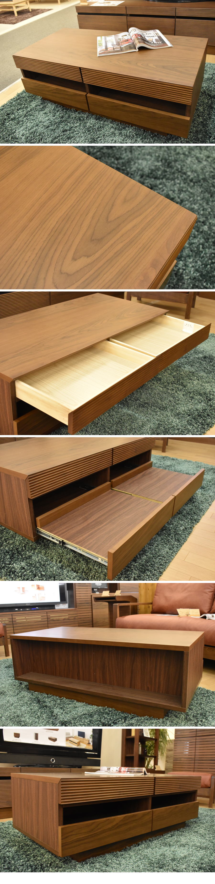 天然木アルダー無垢材スライドトレー付き収納センターテーブルです。 ルーバー前板はアッシュ無垢を使用し天板共に斜めにカットしスッキリ見せます。 小引出し2杯に背面収納、スライドトレーはパソコンなどの収納に便利です。 高級感あるワンランク上のテーブルです。 |